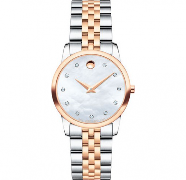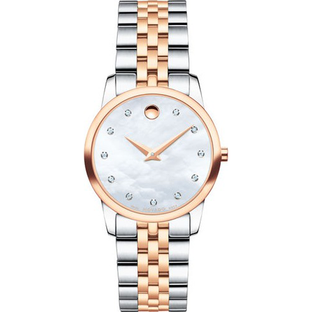 Women’s Museum Classic watch, 28 mm stainless steel and rose gold PVD-finished case, round white mother-of-pearl dial with 11 diamond markers (0.043 t.c.w.) and rose gold-toned dot and hands, stainless steel and rose gold PVD-finished link bracelet with deployment clasp.