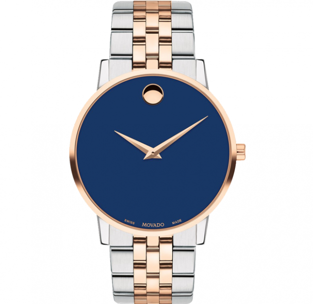 Men’s Museum Classic watch, 40 mm stainless steel and rose gold PVD-finished case, blue Museum dial with rose gold-toned dot and hands, stainless steel and rose gold PVD-finished link bracelet with push-button deployment clasp.