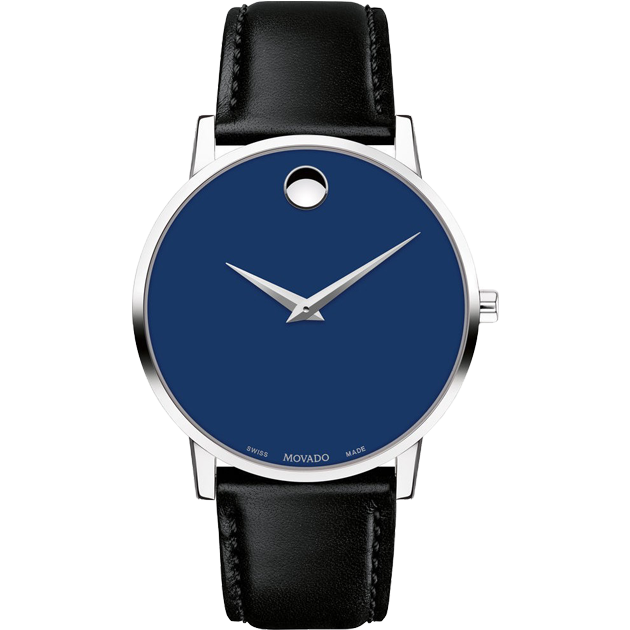 Men’s Museum Classic watch, 40 mm stainless steel case, blue Museum dial with silver-toned dot and hands, black calfskin strap with stainless steel buckle.