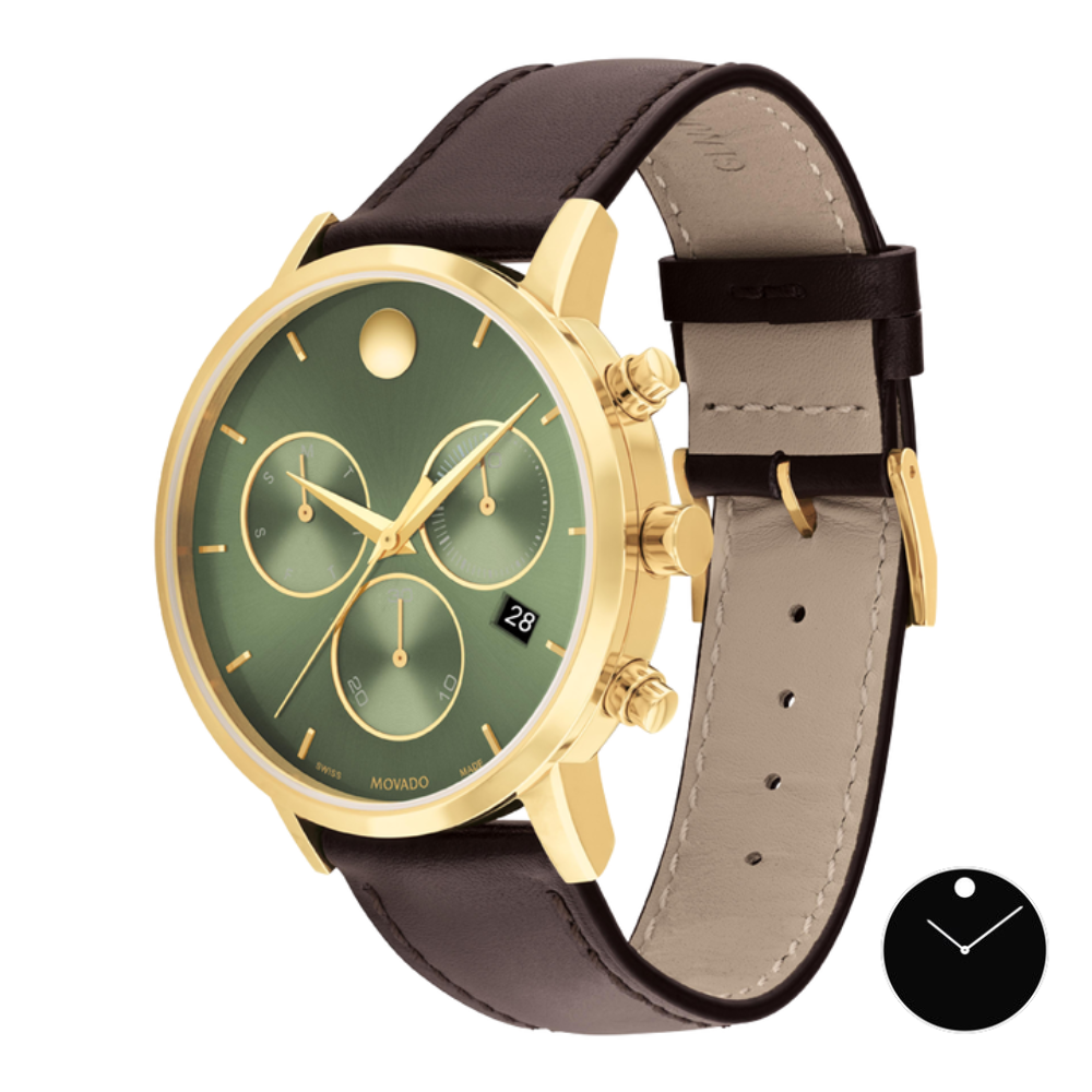 Museum Classic là phiên bản tinh khiết nhất của Movado's Museum Dial—một biểu tượng của thiết kế hiện đại được trưng bày tại các viện nghệ thuật trên toàn thế giới. Chiếc đồng hồ bấm giờ 42mm này có mặt số màu xanh lá cây với các mặt số phụ tông màu, dây đeo bằng da màu sô cô la và dấu chấm đặc trưng của chúng tôi ở vị trí 12 giờ. Mặt số màu xanh lá cây có vạch chỉ giờ, Đường kính vỏ 42, Chất liệu vỏ Thép không gỉ mạ vàng vàng nhạt, Chế tạo mặt kính Sapphire, Khả năng chống nước 30 mét, Bộ máy Bộ máy bấm giờ thạch anh Thụy Sĩ, Dành cho nam, Dây đeo Dây đeo bằng da bê màu nâu, Dây đeo vòng tay.
