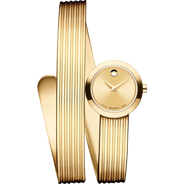 Women’s Museum Wrap watch, 20 mm yellow gold PVD-finished stainless steel case, yellow gold-toned soleil Museum dial with gold-toned dot and hands, channel-textured yellow gold PVD-finished stainless steel hinged double-wrap bangle bracelet.