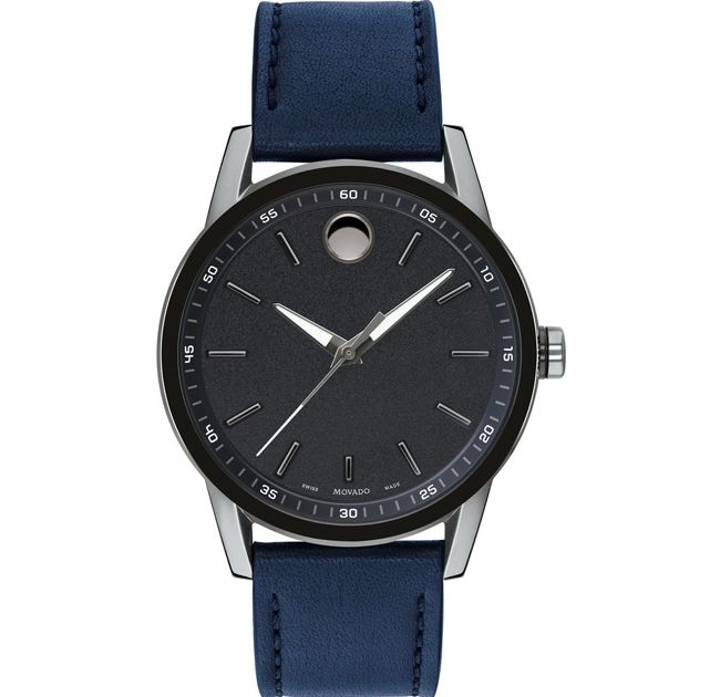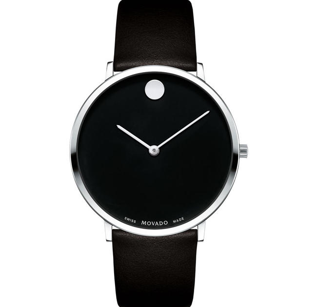 Movado Museum Dial NGH watch, 40 mm stainless steel case, 6.30 mm thin, with yellow dial and stainless steel original flat dot and stick hands, yellow calfskin strap with stainless steel classic tongue buckle.