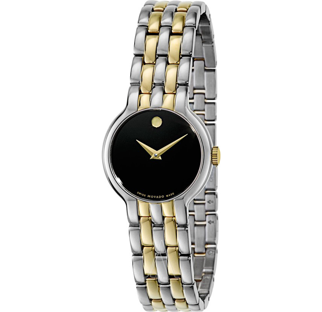Women’s Novella watch, 24 mm polished stainless steel case, black mother-of-pearl Museum dial with silver-toned dot and hands, polished stainless steel faceted bangle bracelet with back sizing links and jewelry clasp.