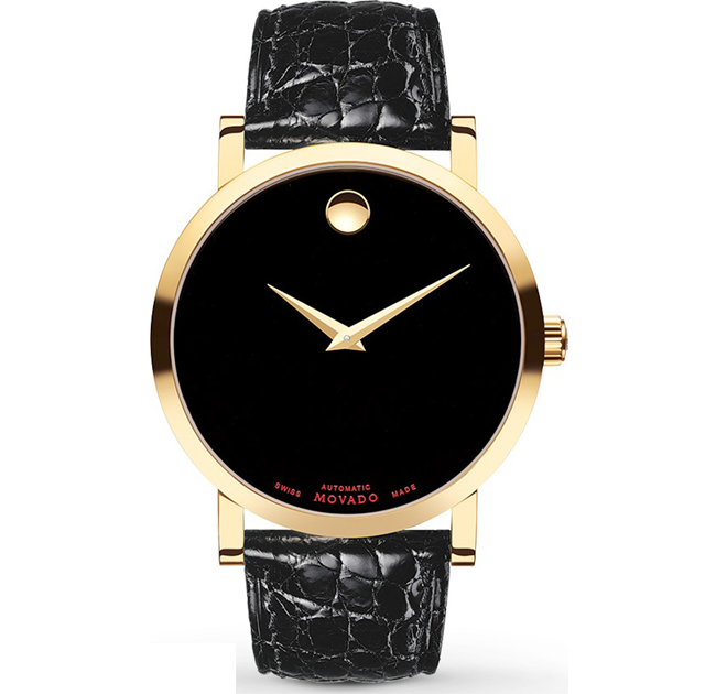 Stainless steel case with a black alligator leather strap. Fixed stainless steel bezel. Black dial with silver-tone hands. The Movado dot marks the 12 o’clock position.