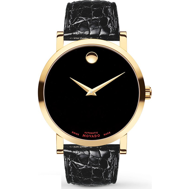 Men’s Red Label automatic watch, 42 mm yellow gold PVD-finished stainless steel case with exhibition back, black Museum dial with yellow gold-toned dot and hands, and red lettering, black alligator strap with yellow gold PVD-finished stainless steel buckle.