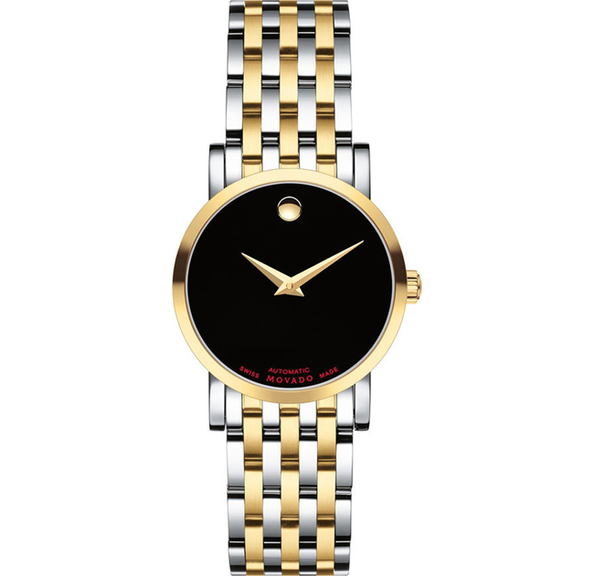 Distinguished by red lettering on the black Museum dial that has a silver-tone dot and hands, this Red Label women’s watch from Movado epitomizes elegance. Stainless steel case with a black leather strap. Black dial with silver-tone hands. Automatic movement.