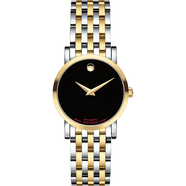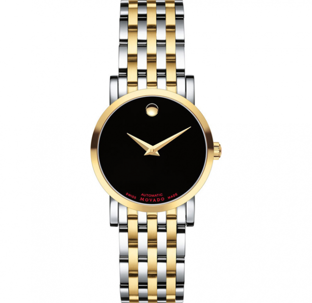 Called the Red Label for its red lettering on the black Museum dial, this lovely women’s watch from Movado features a Swiss automatic movement that is visible through an exhibition case back on the 26mm stainless steel and yellow-gold-tone PVD finish case.
