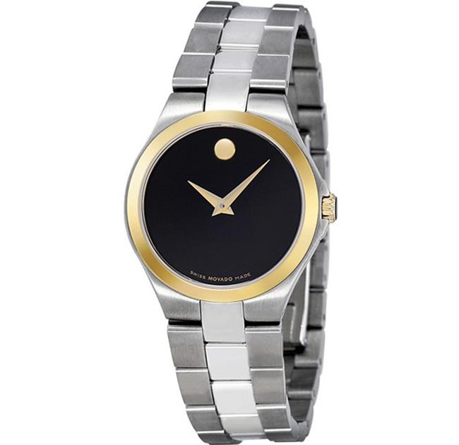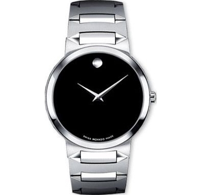 Women’s Sapphire watch, 28 mm stainless steel bezel-free case with flat edge-to-edge sapphire crystal, round silver mirror dial with silver-toned dot and hands, stainless steel jewelry-style faceted link bracelet with butterfly deployment clasp.