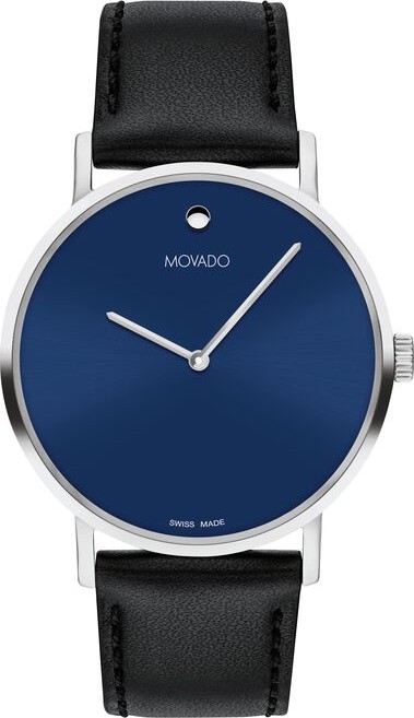 Đồng hồ đặc trưng Movado, vỏ thép không gỉ mạ vàng 40mm, mặt số màu đen, dây đeo bằng da màu đen