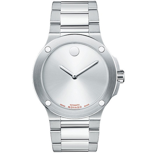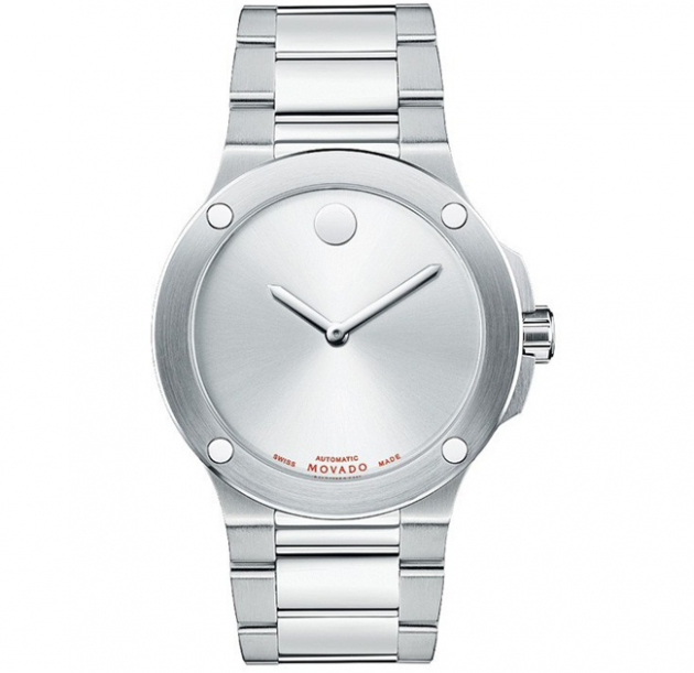 Men’s SE Extreme watch, stainless steel case and bracelet, silver soleil Horwitt Museum® dial with flat dot, Swiss automatic movement. Stainless steel case with a stainless steel bracelet. Fixed stainless steel bezel. Silver dial with silver-tone hands. Luminescent Movado ‘dot’ appears at the 12 o’clock position. Automatic movement. Scratch resistant sapphire crystal. Fluted crown. Skeletal case back.