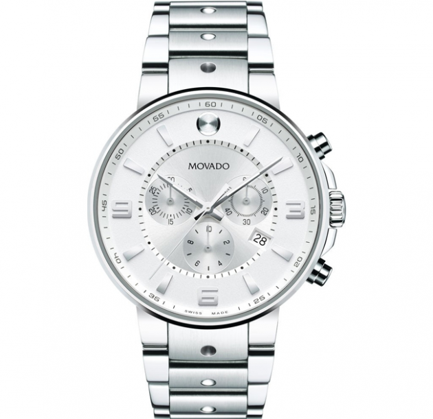 Stainless steel case with a stainless steel bracelet. Fixed stainless steel bezel. Silver dial with luminous silver-tone hands and index hour markers. Arabic numerals mark the 3, 6 and 9 o’clock positions. Minute markers around the outer rim. The Movado dot apperas at the 12 o’clock position.