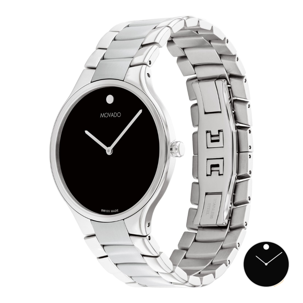 Đồng hồ Movado Serio dành cho nam, vỏ thép không gỉ 38mm và dây đeo mắt xích có khóa cài, mặt số Museum màu đen, tinh thể sapphire, bộ máy thạch anh Thụy Sĩ