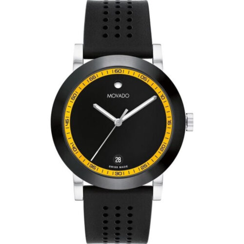 Thiết kế mang tính biểu tượng kết hợp với phong cách thể thao. Đồng hồ Movado Signature Sport dành cho nam, vỏ thép không gỉ 42mm với vành PVD màu đen, mặt số màu đen có kim thép không gỉ đánh bóng với dạ quang, điểm nhấn màu vàng, dây đeo cao su màu đen, tinh thể sapphire, bộ máy thạch anh Thụy Sĩ