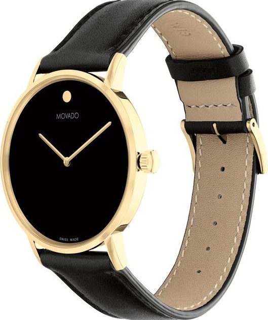 Movado Signature watch, 40mm gold-plated stainless steel case, black dial, black leather strap