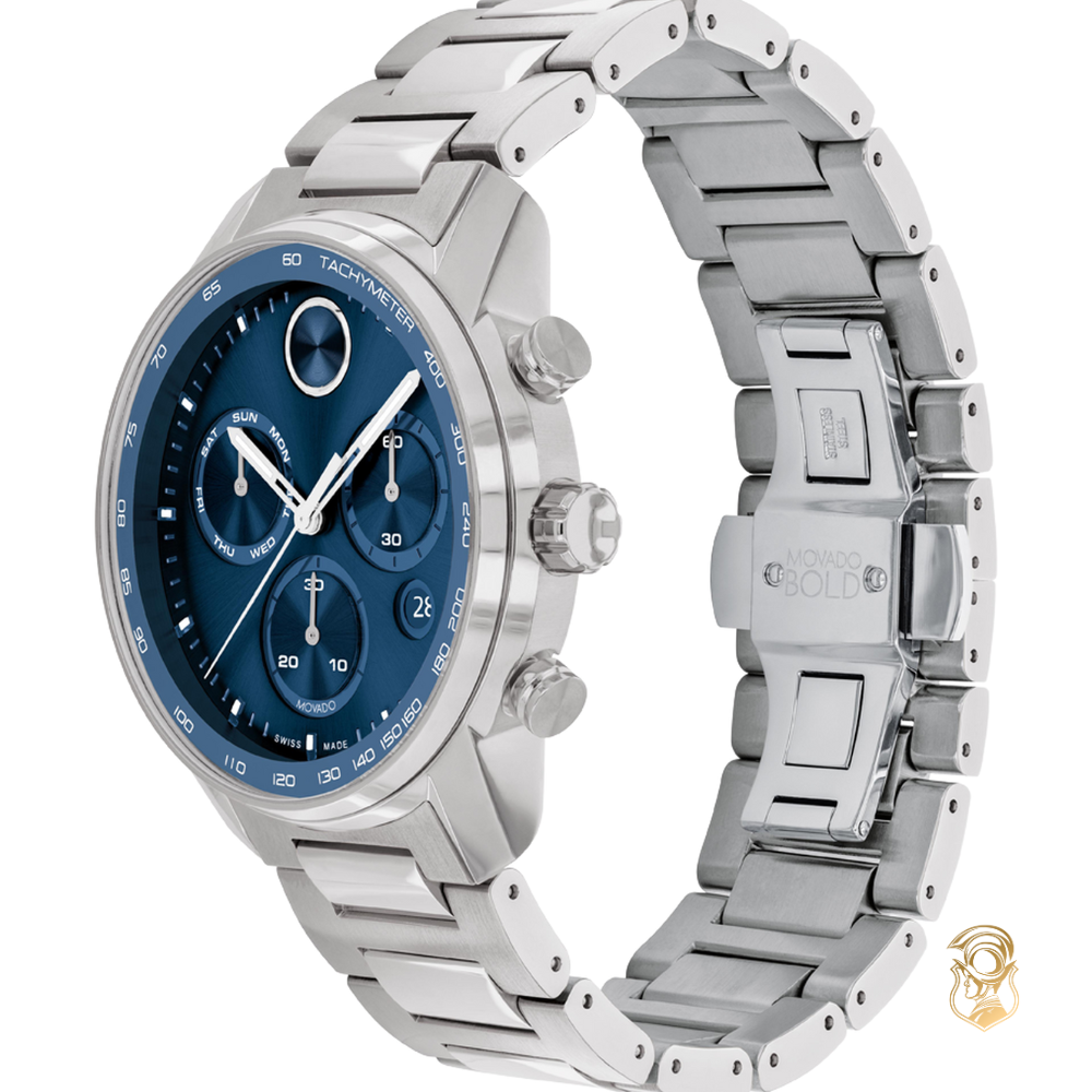 Movado.com ĐỘC QUYỀN Movado BOLD Verso Chronograph, vỏ thép không gỉ 44 mm và dây đeo có thang đo tốc độ. Có mặt số chronograph màu xanh, điểm nhấn Swiss Super-LumiNova® và chi tiết cửa sổ ngày. Mặt số: Xanh lam có vạch chỉ giờ. Đường kính vỏ: 44. Chất liệu vỏ: Thép không gỉ. Cấu tạo pha lê: Khoáng K1. Khả năng chống nước: 5 ATM/ Bộ máy: Bộ máy bấm giờ thạch anh Swiss. Dành cho: Nam. Dây đeo: Vòng đeo tay dạng mắt xích. Vòng đeo tay: Vòng đeo tay dạng mắt xích bằng thép không gỉ