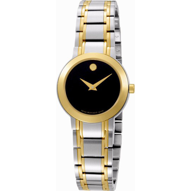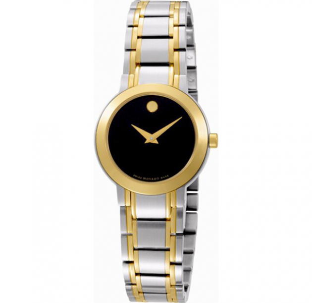 Two-tone stainless steel case with a two-tone steel link bracelet. Fixed gold-tone stainless steel bezel. Black museum dial with gold-tone hands. No markers. The signature Movado ‘dot’ appears at the 12 o’clock position. Battery operated Swiss quartz movement. Scratch resistant sapphire crystal. Solid case back. Case diameter: 28 mm. Case thickness: 6 mm. Deployment clasp with push button release. Water resistant at 30 meters / 100 feet. Movado Womens Stiri Two-tone Watch