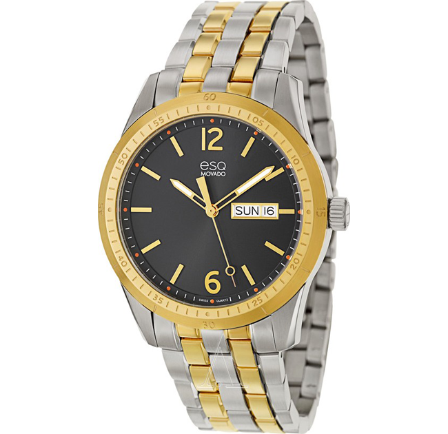 Gold-tone stainless steel case with a black leather strap. Fixed gold mirrored bezel. Silver dial with gold-tone hands and index hour markers. Minute markers around the outer rim. Movado dot marks the 12 o’clock position.