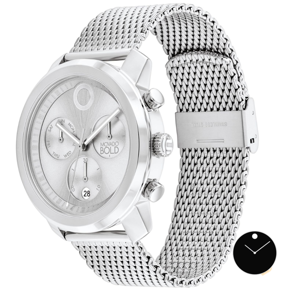 Đồng hồ bấm giờ Movado Trend Propel dành cho nam, vỏ thép không gỉ 44 mm và dây đeo lưới, mặt số màu bạc, tinh thể khoáng K1, Bộ máy bấm giờ Thụy Sĩ
