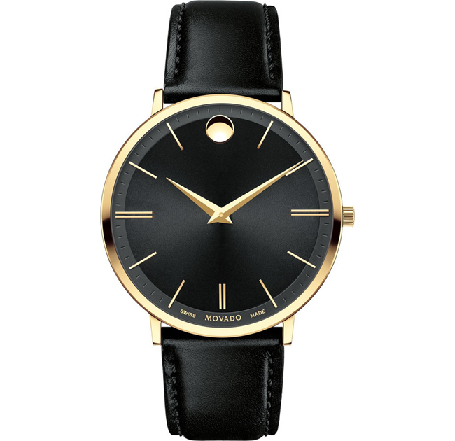 A rich brown leather strap and vivid blue dial accentuate this handsome dress watch from the Ultra Slim collection by Movado. Chocolate brown leather strap with classic tongue buckle closure. Round gold-tone PVD-finished stainless steel case, 40mm. Blue dial with fine concentric-circles texture, gold-toned stick indices, two hands and signature dot. Swiss quartz movement.