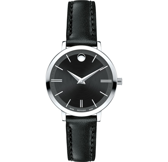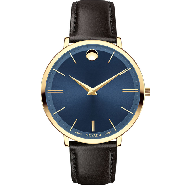 Classic styling, a complementing silver-white dial with rose gold-tone accents and a rich chocolate leather band add luxury to this Ultra Slim collection watch by Movado.