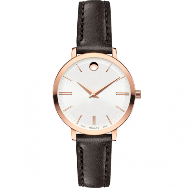 A luxury watch with classic styling gets a modern update with a delicate band in brown leather, from the Ultra Slim collection by Movado. Brown leather strap with classic tongue buckle. Round rose gold-tone PVD-finished stainless steel case, 28mm. Silver-white dial with fine concentric-circles texture, rose gold-tone applied stick indices, two hands and signature dot. Swiss quartz movement