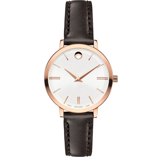 Men’s Movado Ultra Slim watch, 40 mm stainless steel case, 6.3 mm thin; blue CD-cut dial with fine concentric-circles texture, silver-toned signature dot and thin applied stick markers; stainless steel bracelet with push-button deployment clasp.