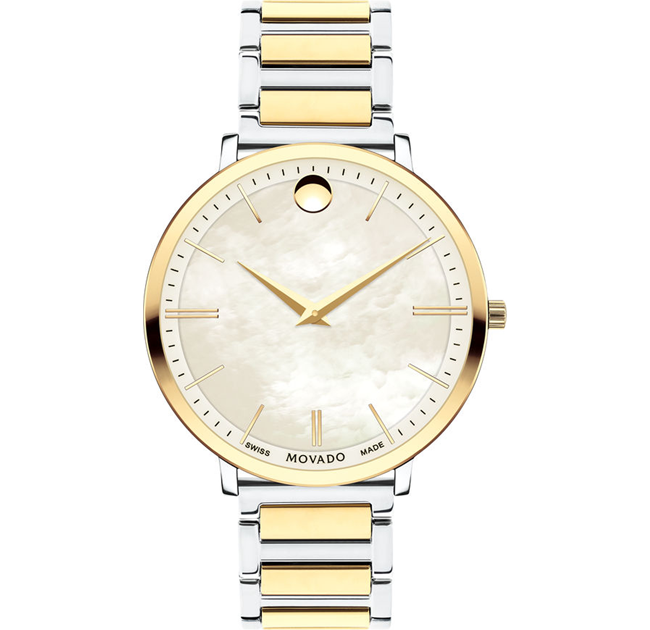 Women’s Movado Ultra Slim watch, 35 mm stainless steel case, 6.3 mm thin; white mother of pearl dial, silver-toned signature dot and thin applied stick markers; stainless steel bracelet with push-button deployment clasp.