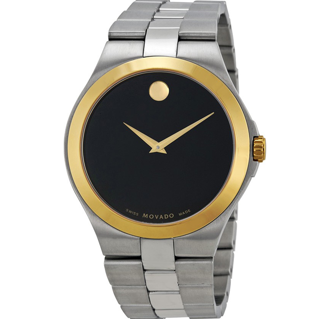 Men’s Movado Ultra Slim watch, 40 mm black PVD-finished stainless steel case, 6.30 mm thin; black dial, gunmetal-toned signature dot and thin applied stick markers; black PVD-finished stainless steel bracelet with push-button deployment clasp.