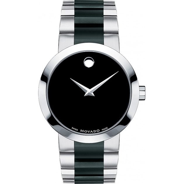 Stainless steel case with a two-tone (black and silver-tone) stainless steel bracelet. Fixed stainless steel bezel. The signature Movado ‘Dot’ appears at the 12 o’clock position.