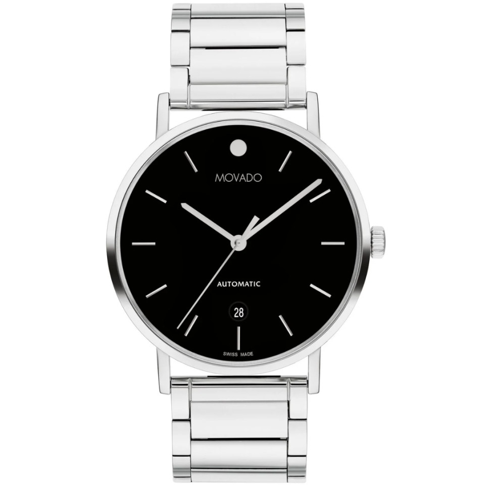 Vỏ và dây đeo bằng thép không gỉ tông vàng hồng. Vành thép không gỉ tông vàng hồng cố định. Mặt số màu xanh lá cây với kim và vạch chỉ giờ tông vàng hồng. Dấu chấm Movado xuất hiện ở vị trí 12 giờ. Vạch chỉ phút xung quanh vành ngoài. Loại mặt số: Analog. Kim và vạch chỉ giờ phát quang. Hiển thị ngày ở vị trí 3 giờ. Bộ máy thạch anh. Tinh thể khoáng chống trầy xước. Núm điều chỉnh kéo/đẩy. Nắp lưng chắc chắn. Hình dạng vỏ tròn, kích thước vỏ: 42 mm. Tháo lắp bằng khóa bấm nút. Chống nước ở độ sâu 30 mét/100 feet. Chức năng: ngày, giờ, phút, giây