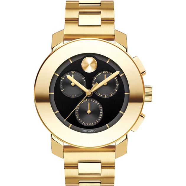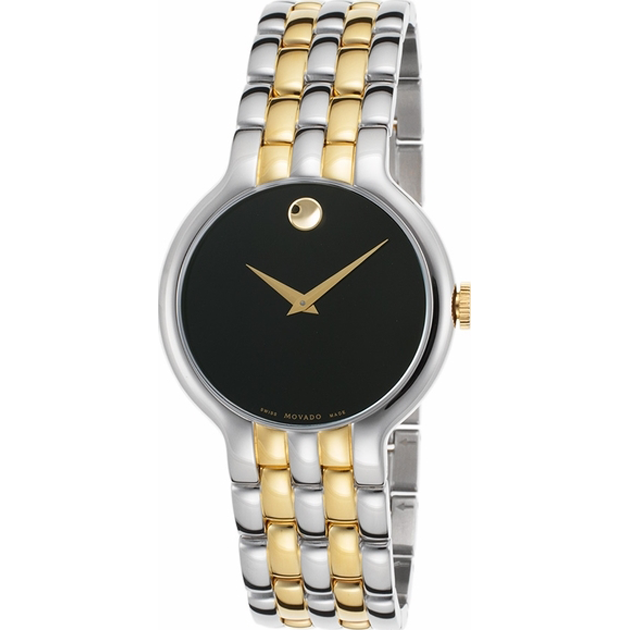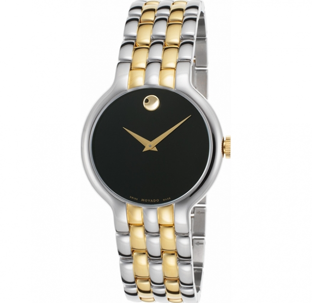 An elegant two-tone stainless steel design adds color and class to this Movado timepiece. The polished design features a dark black dial and signature Movado dot.