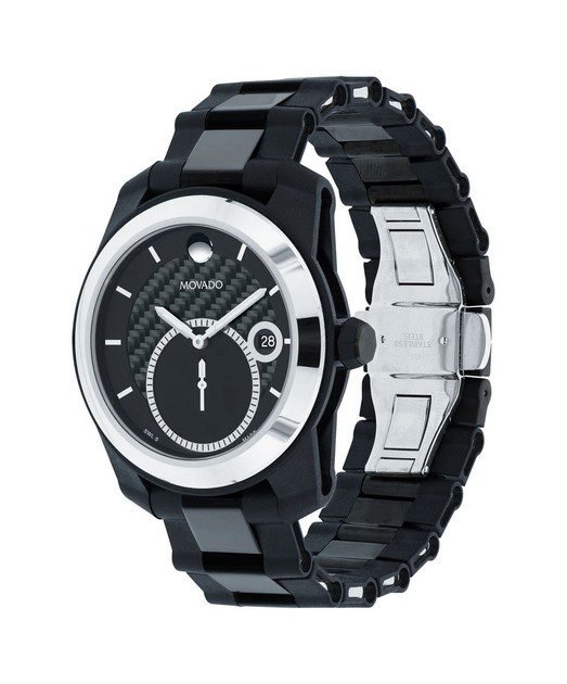 Men’s Vizio watch, 42 mm case with tungsten carbide bezel, black PEEK® carbon fiber-reinforced resin skeleton framework and polished black PVD-finished stainless steel core, black carbon fiber dial with small seconds subdial, silver-toned signature dot, applied stick markers and luminescent hands, date display, and white and silver-toned accents, matte black PEEK and polished black PVD-finished stainless steel link bracelet, sapphire crystal, Swiss quartz movement, water resistant
