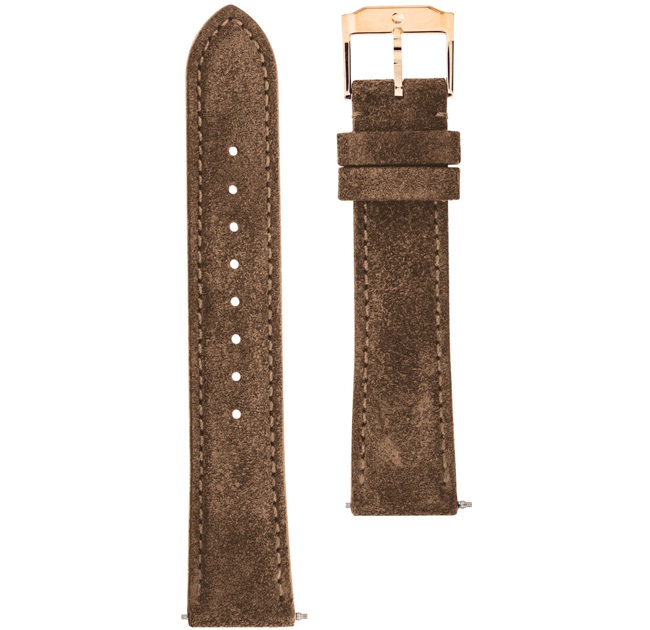 Navy blue smooth leather strap with matching top-stitching, dual keepers, tension pins and classic yellow gold-toned (YG) buckle; fits select Heritage Series, Red Label, 1881 Automatic, Movado Ultra Slim models.