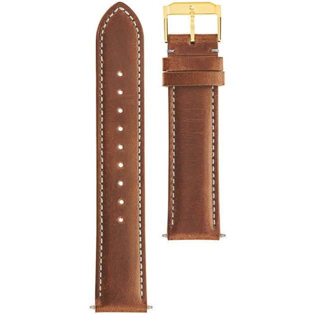 18mm wide cognac brown smooth leather strap with white top-stitching, dual keepers, tension pins and classic rose gold-toned (RG) buckle; fits all 36mm Heritage Series models.