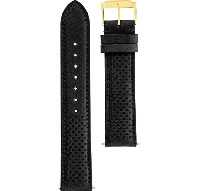 20mm wide cognac brown smooth leather strap with white top-stitching, dual keepers, tension pins and classic yellow gold-toned (YG) buckle; fits all 40mm Heritage Series models; select Red Label, 1881 Automatic, Movado Ultra Slim models.