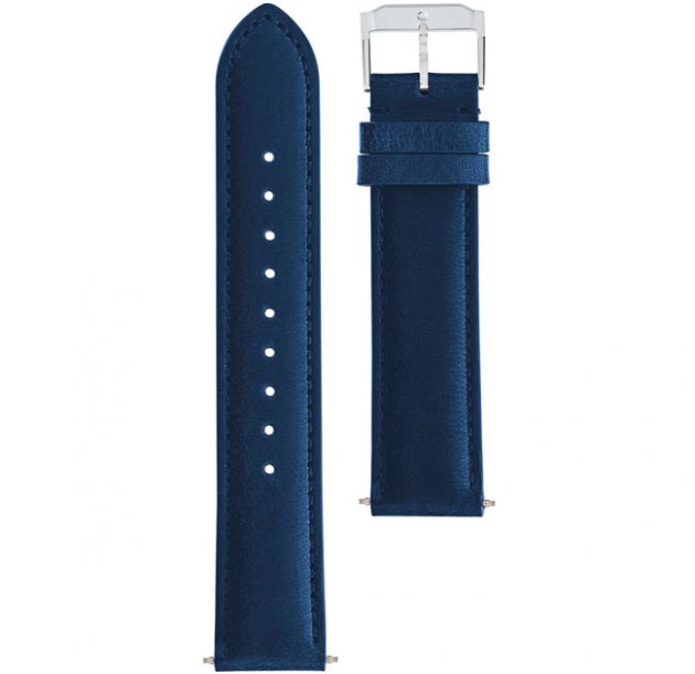 Navy blue smooth leather strap with matching top-stitching, dual keepers, tension pins and classic stainless steel (SS) buckle; fits select Heritage Series, Red Label, 1881 Automatic, Movado Ultra Slim models.